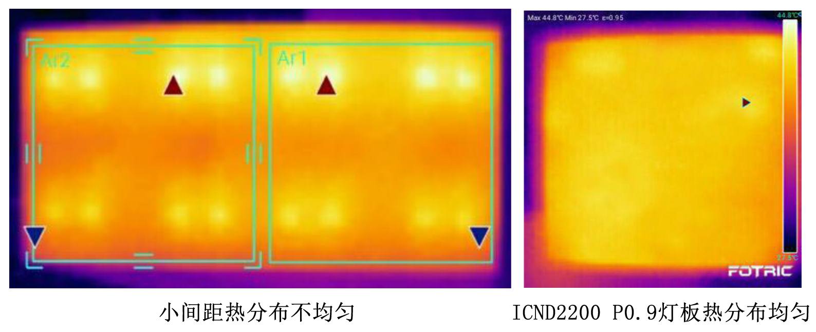 燈板溫度散熱不均是困擾LED小間距的另一大問題,由于通常行線設(shè)計(jì)一行帶載燈珠較多的原因,通常在大屏模組間有偏青問題,由于紅色燈珠電流大,往往紅色芯片處也是模組溫度最高的地方。目前,由于驅(qū)動方案的局限性,燈板熱分布不均問題始終無法得到改善。而ICND2200采用分區(qū)域方式,可均勻分開散熱,從而有效解決熱分布不均問題,進(jìn)一步提高了燈板的穩(wěn)定可靠性。