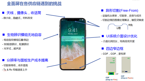 手機產業(yè)鏈正面臨全新的挑戰(zhàn),包括設計、制造以及工藝上的種種難點。具體問題如:聽筒、前置攝像頭的位置如何重新規(guī)劃,如何解決正面生物識別的問題,如何應對面板因切割率降低而產生的成本問題,如何解決異型切割問題……凡此種種,是整個供應鏈需要面臨的共同挑戰(zhàn)。