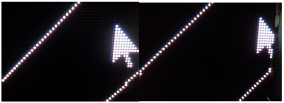 下圖為ICN2038與某友商產(chǎn)品在消鬼影方面的對比。可以發(fā)現(xiàn):單獨(dú)斜線測試時(shí),兩款產(chǎn)品都可以消除上下鬼影。但是,在斜線上疊加鼠標(biāo)后,競爭產(chǎn)品在同一行出現(xiàn)鬼影,而ICN2038沒有。