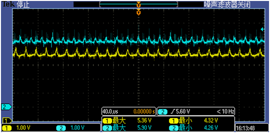 黃色波形為ICN2038,藍(lán)色波形為友商產(chǎn)品。友商產(chǎn)品開關(guān)噪聲,容易導(dǎo)致更大的電源紋波。